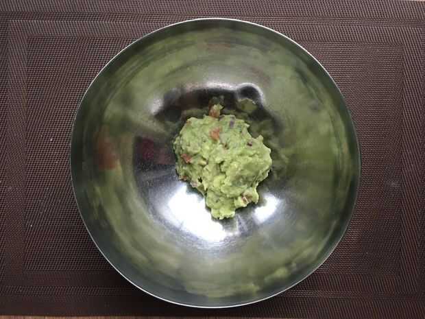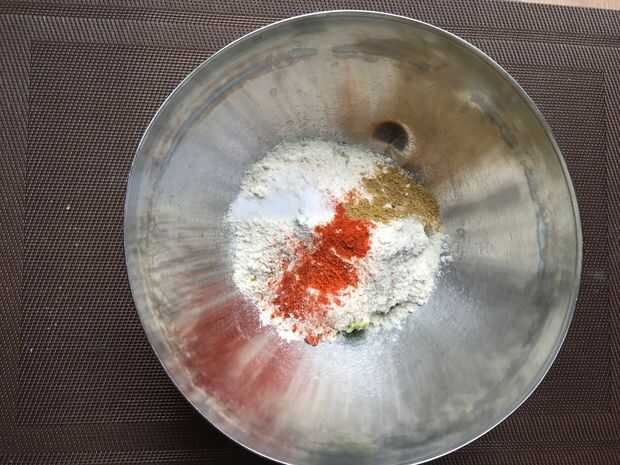1) en un bol, añadir el guacamole, harina de trigo integral, Chile en polvo, comino molido, aceite y sal.