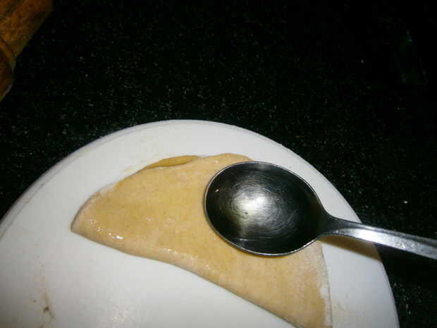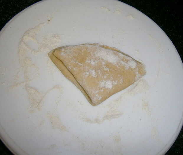 Doble desde el centro del semicírculo de forma triangular. Espolvorear con harina de trigo.