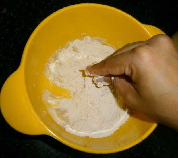 Agregando algo de agua a la masa en partes, comenzar a amasar. Seguir a amasar la masa. Seguir añadiendo agua según se requiera. Si se agrega el agua a la vez la harina será demasiado pegajosa para manejar.