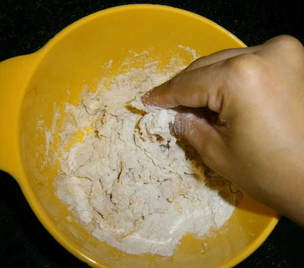 Tomar harina de trigo integral/atta en un bol. Seive la harina de trigo con sal. Añadir un poco de agua y mantequilla de búfalo y empezar a mezclar.
