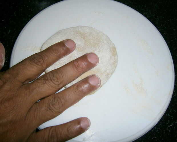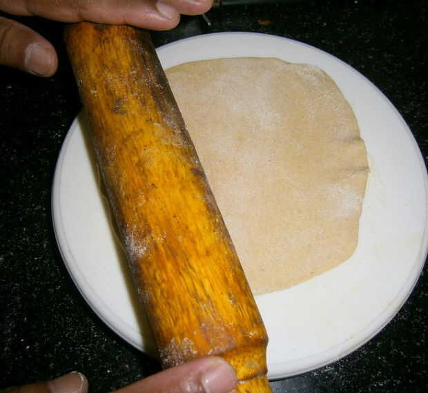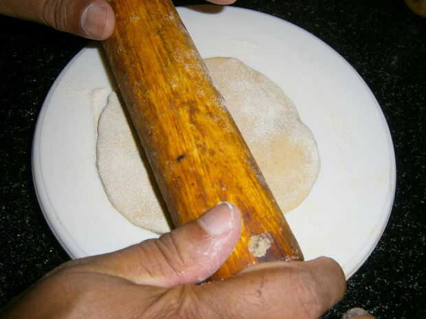 Inicio rodando la bola de masa en un plano alrededor de círculo. Espolvorear algunos harina Si la masa comienza a estirar o a ser pegajosa mientras rueda. Asegúrese de que la rotis no son gruesos como toman mucho tiempo para cocinar.