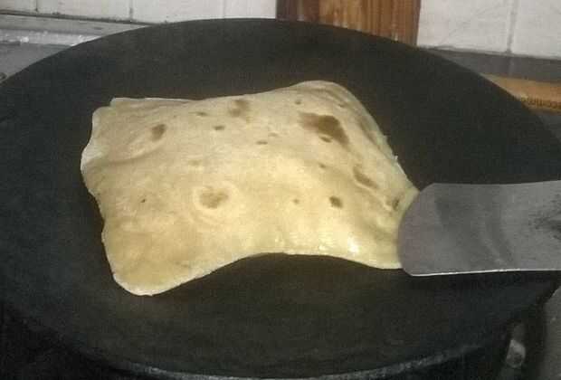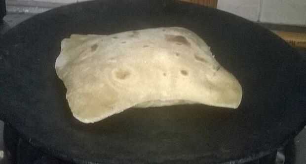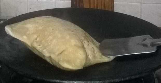 Puede hincharse incluso en la sartén. Dar una prensa pequeña a los lados de chapati con su cuchara. La parte media se soplo para arriba. La llama debe ser de medio y el pan lo suficientemente caliente para que sopla para arriba. Del mismo modo hacer presionar alrededor.