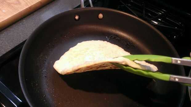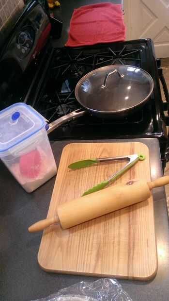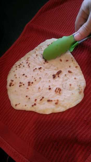 Reunir el equipo necesario. Colocar la placa que voy a liar mi pan al lado de la sartén y luego mi toalla al lado. Como una línea de montaje. Lo hago porque estos panes se cocinan tan rápido que como se cocina el uno pan puede rodar hacia fuera el otro. No tiene tiempo para contestar el teléfono o ejecute para el lavado. Por el momento obtendrá que su pan será quemado. Sé por experiencia.