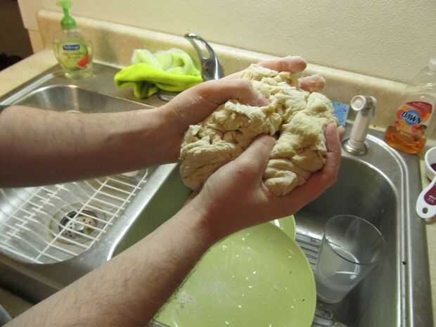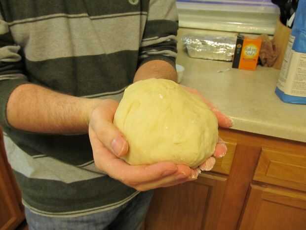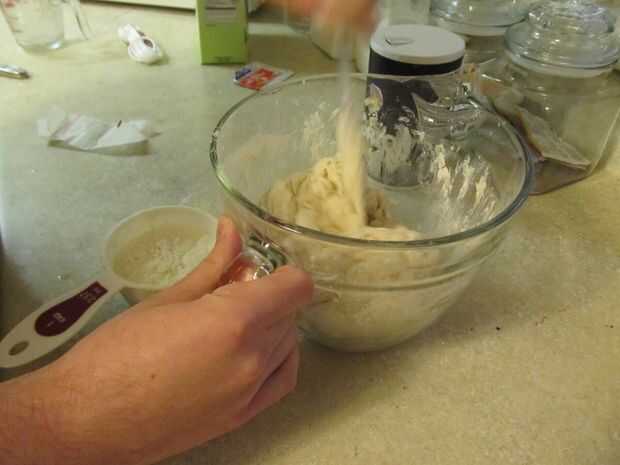 Una vez que la masa forme un lío húmedo, añadir un poco de la tercera taza a la vez y doblar la nueva harina en la masa. No agregue la Copa toda en uno, ya no se necesite. Agregar un poco a la vez (dos cucharaditas) y amasar. Después de unos minutos la pasta debe dejar de lo pegarse a los lados del tazón de fuente tanto y empezar a formar una bola. Añada la harina y amasar hasta que la bola de masa un poco pegajosa. En ese momento, gire en el recipiente en una superficie limpia y enharinada o sólo harina de las manos y recogerlo. Amasar por doblar una y otra vez en distintas direcciones hasta que consigue pegajoso otra vez, y luego espolvorear de harina un poco más en él. Amasar hasta que la masa esté suave y ligeramente pegajosa. Debe formar una bola bastante sólida.