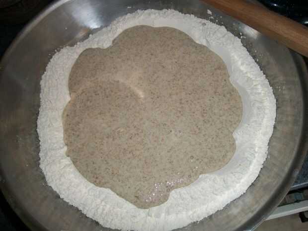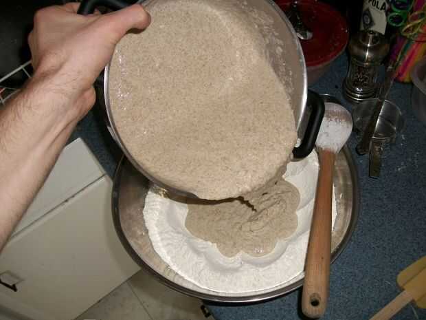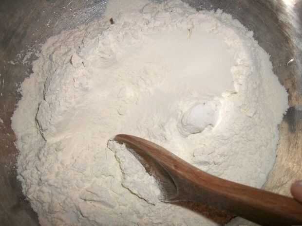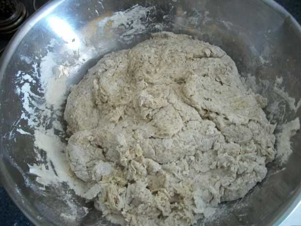 Hago esto en el recipiente. Porque los ingredientes húmedos fueron vertidos en el pozo de la harina, probablemente todavía hay harina cubriendo los lados y fondo del recipiente. Alternativamente, el método más común de amasar la masa es ligeramente una superficie de madera la harina y amasar en eso.