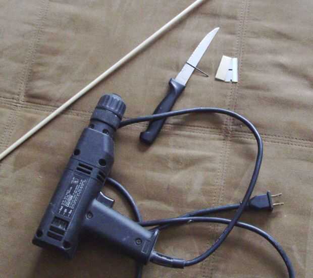 Así, entonces, ¿qué un auto respeto, pellizcando Doblón Galeote necesidad de hacer su propio lame? Bien, este Galeote utiliza 1/4" espiga común, y un solo filo"cuchilla"-maquinilla de afeitar de estilo. Las herramientas que necesitaba eran un serrado cuchillo (porque es más cercano a la mano que una sierra), un taladro y una 1/16 broca (1,6 mm es suficiente).
