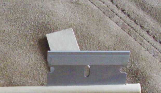 Tomar la cartulina envoltura de su cuchilla y póngala a un lado (no descartar, sin embargo). Con un extremo de la cuchilla sobre 1/4", más o menos desde el extremo de la varilla y el resto con la longitud de la barra, presiona la hoja en la madera apenas lo suficiente para dejar una línea - se convierta en su plantilla para taladrar.