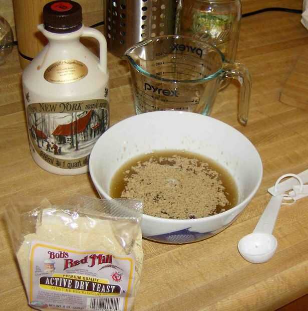 Para comprobar que la levadura es buena y para activarlo, añadir 2 T de su edulcorante a 1 taza de agua tibia (no caliente). Cuando el azúcar se disuelva, agregar levadura T 1 y revolver. Deje el recipiente para descansar en un lugar caliente (como la tapa de la estufa) durante 10-15 minutos, o hasta que quede espumosa.