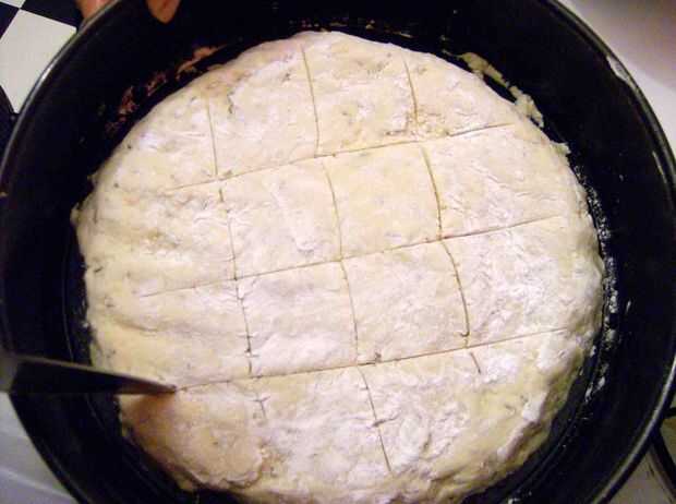 Polvo con más harina de tapioca y algunas líneas de corte ligeramente en la parte superior. Esto es principalmente para la estética, pero ayuda a ver cuando la masa ha aumentado.