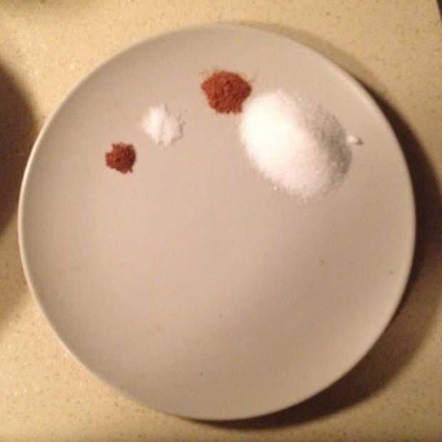 1. Messen Sie die trockenen Zutaten en eine Platte oder contenedor (2 1/2 T Zucker, Zimt T de 1/4, 1/8 T Muskat und 1/4 TL Salz).