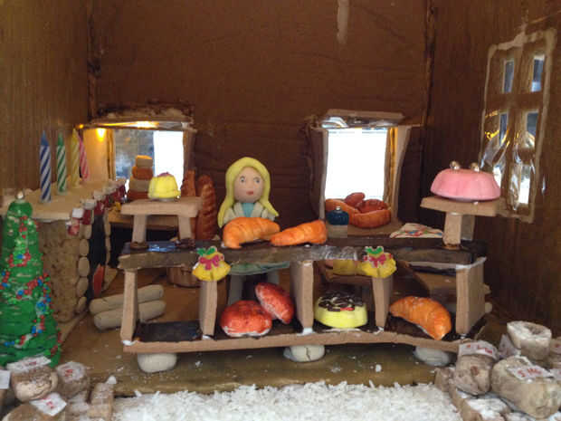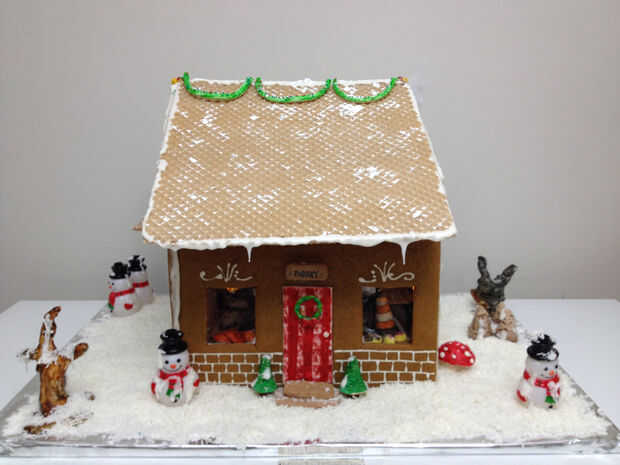el techo se compone de chocolate con leche oscuro, así como círculos de chocolate blanco. Han sido capas para dar el aspecto de "Tejas". La guía se compone de grandes bayas suecas y naranja Mike & Ike. También hay varios tipos de dulces, inc