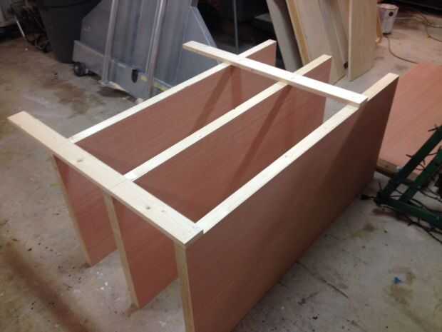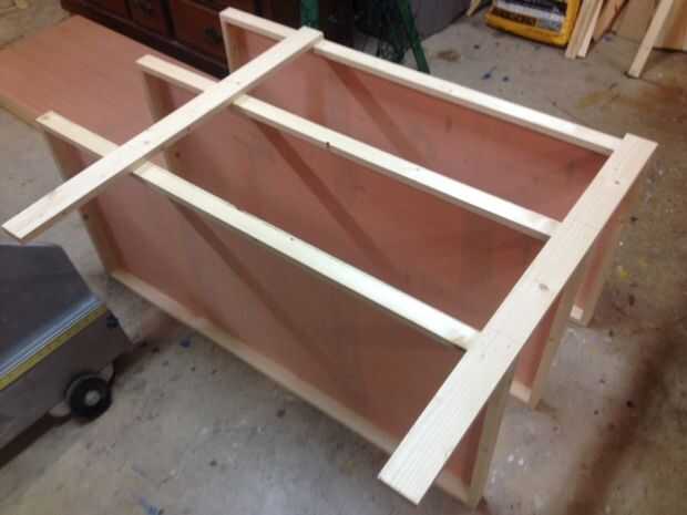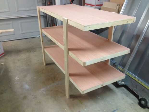 Los estantes se espacian aproximadamente 12" aparte. Usé 1 "x 3"s para hacer el armazón del carro trabajo y atornilladas cada plataforma una distancia igual desde la última. Salí de aproximadamente 12" las piernas en el último estante. Luego volví y doble de 1 "x 3" s entre y debajo de cada estante a robusto para arriba. Un cambio de diseño estético que hice fue traer hacia adelante de la pata trasera para que la rueda no colgaría hacia fuera más allá de la estructura como en el boceto original. En la base de cada pata estaba atado a una rueda pequeña para permitir que el carro ruede. El regreso de dos ruedas son fijas, las dos delanteras giratorias.