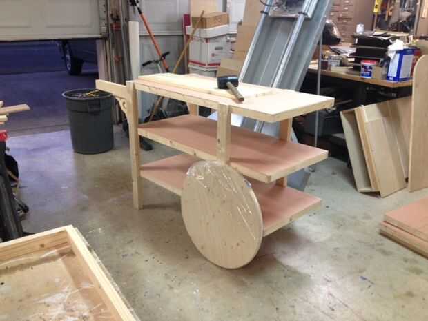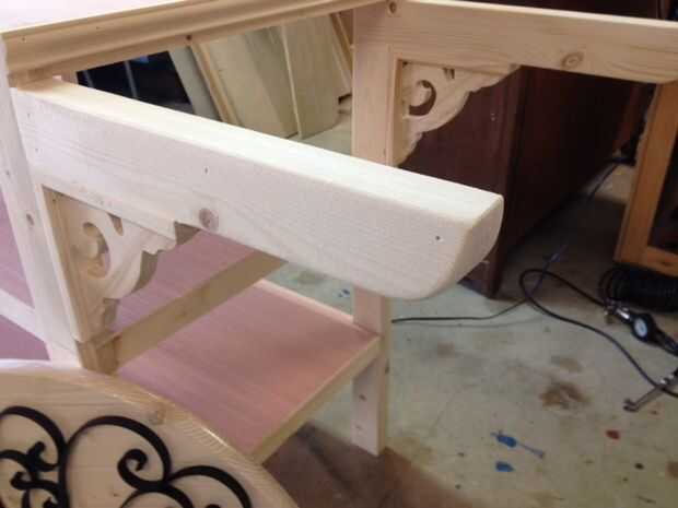 Las manijas de carro se hacen de doble 1 "x 3"s que se extiende desde la parte delantera. Utiliza una sierra caladora para áspero hacia fuera una forma de la manija y me fui sobre él con la lijadora para redondear hacia abajo aún más. Luego he añadido un par de soportes decorativos madera baratos debajo de los brazos en la espalda para darle un look más vintage. La última imagen es con las tapas de tabla en lugar que se utilizará para las ruedas.