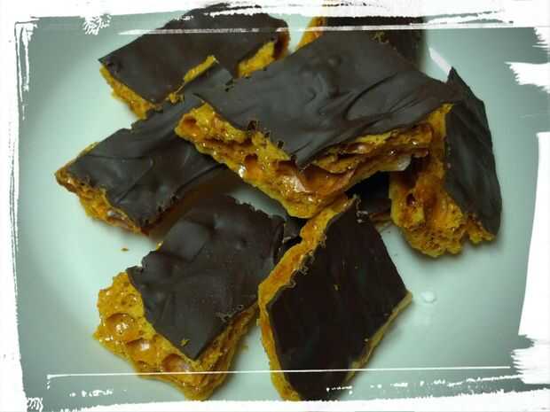 Cuando esté fría la bandeja de espuma de caramelo caliente y burbujeante, repartidas chips chocolate derretidos la hoja de caramelo en forma de panal. Deje que se enfríe. (Otra vez, me pegué mina en el congelador. La paciencia es demasiado clasificada). Cuando el chocolate está templado, romper el caramelo en trozos con un tenedor. Comer, crujiente y disfrutar! Guarde el resto en la nevera en un recipiente hermético.