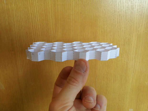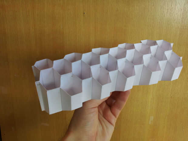 Para construir sus propios panales con secciones variables, descargar la definición de Dinamo o saltamontes adjuntada. Todo lo que necesitas hacer es definir la sección curvas teniendo cuidado de que los extremos se encuentran en la misma línea vertical. El regulador entero define el número de celdas en sentido horizontal. Una vez que has definido la tira enrollada, tienes espejo y copiar el patrón según el ancho de su final en forma de panal, impresión, doblar, pegar y disfrutar!