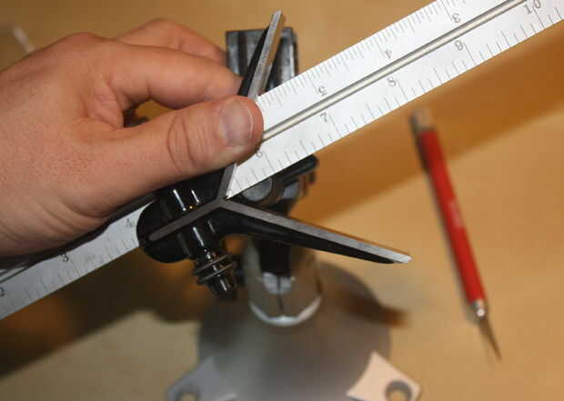 He utilizado el indicador búsqueda de centro de mi tri-Plaza.  Hay maneras más complicadas de la perforación en el centro exacto de un círculo pero esta trabajado para mí.  Usé un cuchillo para marcar unas líneas a través del centro en diferentes rotaciones.
