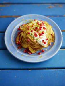 Romper un huevo en un tazón grande. Llene una taza con harina, luego añadir a la taza. Mezcle en el polvo de hornear, si la tienes. Llene la misma copa con la leche y añadir que también con una pequeña pizca de sal marina. Uso un batidor para mezclar todo hasta liso. Mezclar unas 8 cucharadas de coco desecado en tus hotcakes. Cubra el tazón en film transparente y poner a un lado. Mientras tanto, cortar una Granada en medio – mente, puede ser sucio! Haz un tazón y sostenga la Granada, semilla hacia abajo, por encima de la taza. Utilice una cuchara de madera para golpear la parte posterior de la Granada para que las semillas caigan en el recipiente. Hacer esto con ambos lados hasta que todas las semillas en el recipiente. Llene el recipiente con agua, luego escoger cualquier bit blanco que flota a la parte superior y luego drenar el agua. Poner una sartén grande a fuego medio. Coloque la mitad de la mantequilla en la sartén, y una vez que se haya derretido y empieza a burbujear, cuchara de crepes en la sartén, por lo que es aproximadamente el tamaño de una naranja. Usted debe ser capaz de hacer 2 o 3 panqueques en la sartén. Cocinar las tortitas de 1 a 2 minutos, hasta que las burbujas subidita hasta la parte superior. Usando una espátula resistente al calor, cuidadosamente voltearlas les. Cocinar los panqueques para un minuto o así, hasta oro a ambos lados. Cuando se hacen, transferirlos a un plato y cúbralas con papel aluminio para mantener el calor. Cuidadosamente Limpie la bandeja con papel de cocina, luego añadir la mantequilla restante y continuar hasta que la masa se utiliza para arriba. Para servir, tapa tu coco tortitas con una cucharada de yogur y unas semillas de Granada. Rallar encima la ralladura de un limón y una naranja.