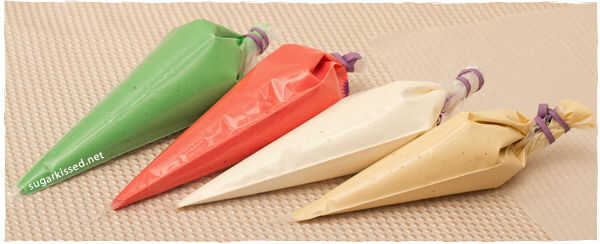 Dividir la masa en cuatro secciones. Usar el colorante para teñir cada sección de un color diferente, rojo, verde, blanco y marfil. Luego, vierta la masa de cada color en una manga pastelera y atar el extremo de la bolsa. Cuando estás listo para utilizar cada color, simplemente cortar la punta y tuberías.