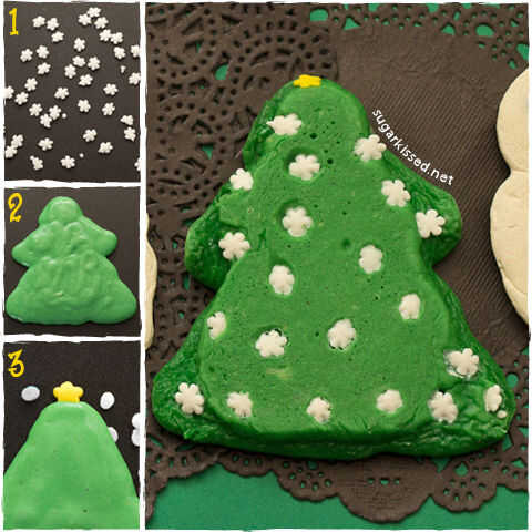 Esparza estrella blanca o sprinkles en forma de flor sobre la plancha. En la parte superior los sprinkles, dibujar formas de triángulo con su masa verde para hacer una forma de árbol de Navidad. Mientras se cocina la masa, coloque una pizca de estrella amarilla en la parte superior del árbol. Una vez el debajo del árbol de Navidad crepe esté cocinada, darle la vuelta para cocinar del otro lado.