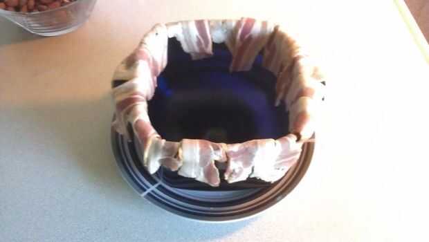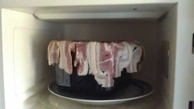 Colgar el tocino a los lados del recipiente y coloque el recipiente en el microondas durante unos 10 minutos.