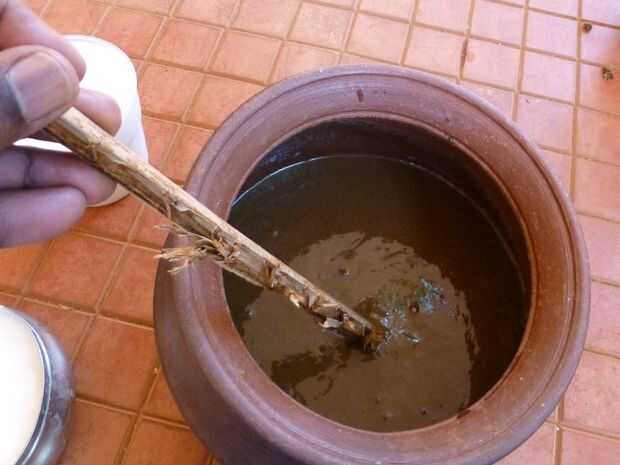 - Mezclar bien con un palo de madera. He utilizado un tallo de hoja de coco para la mezcla.