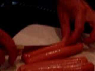 Mientras estás esperando la parrilla calentar, cortar las salchichas por la mitad. No cortar todo el camino, sólo hacer que puede abrirlos. Usar el cuchillo (Duh).