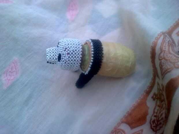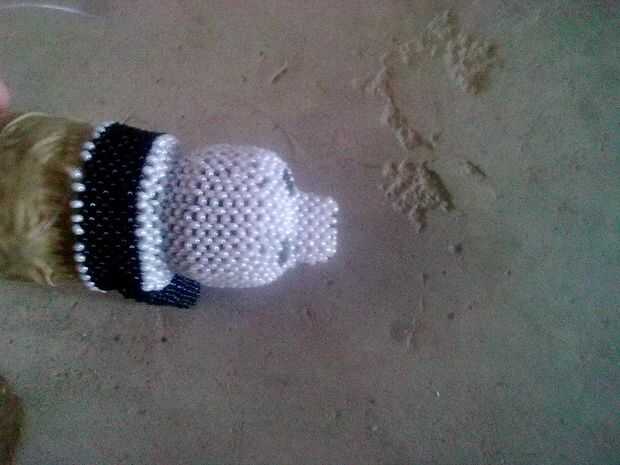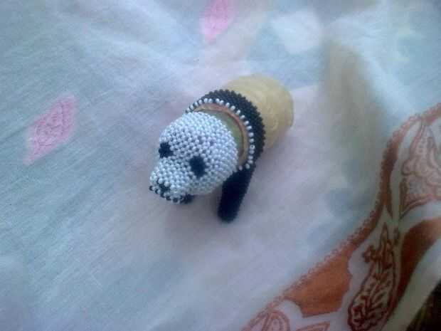 hice piernas de lápices en el centro rodeado por los granos y luego realizar su anillo para que pueda encajar en la cintura de la panda y por último conectar las patas con la cabeza / del cuello.