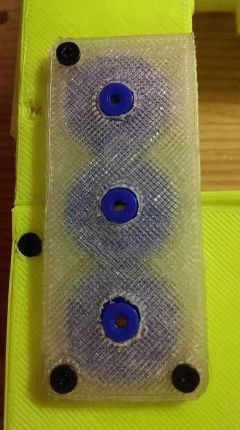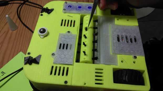 2. A continuación, coloque los 3 engranajes azul a la cubierta inferior y atornillar firmemente la cubierta del engranaje como se muestra en la foto, algún pincel a negro lo colocado en el engranaje azul para convertirse en una barredora de la planta.