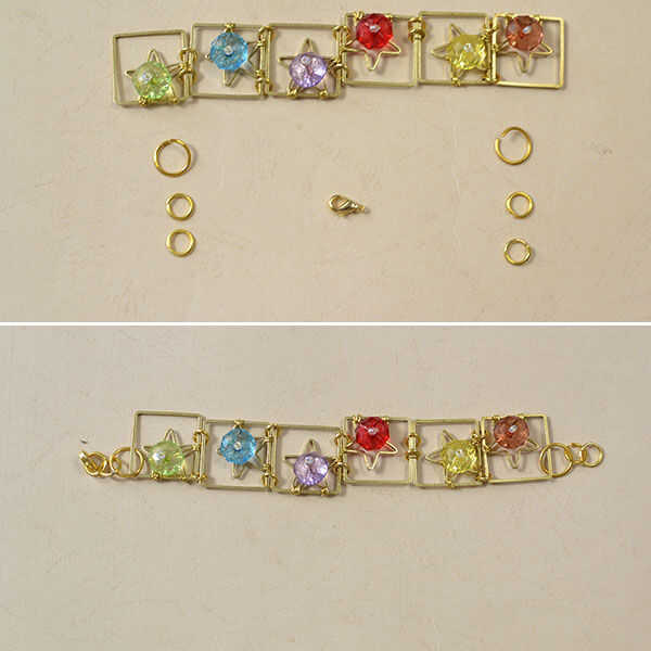 Tomar anillas 10mm 2 y 4 anillas 4mm y conecte un anillo de salto de 10mm y 2 anillas 4mm del lado 3, luego conectar esta pulsera de oro con un corchete de la garra de langosta.