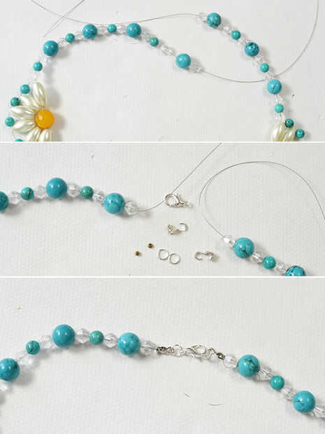 3, añadir consejos grano platino y plata saltan los anillos en los dos lados de la cola del tigre respectivamente. A continuación, conecte los dos extremos de la gargantilla de flor junto a través de un corchete de la garra de langosta plata.
