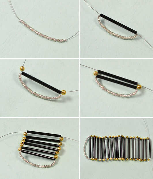 hilo 3, que un 4 mm oro grano redondo para el tigre de dos colas respectivamente. Luego, cruzar las colas de dos tigre a través de otra tira de tubo negro de 3mm;