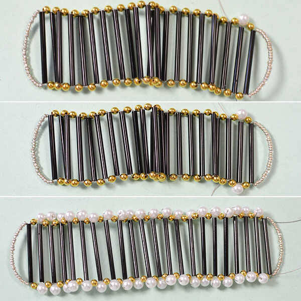 7 de rosca 6mm blanco ronda grano de la perla a la cola del tigre superior. Luego, cruzar la cola del tigre por el grano de oro adyacente (como se muestra en la imagen);