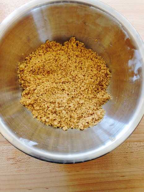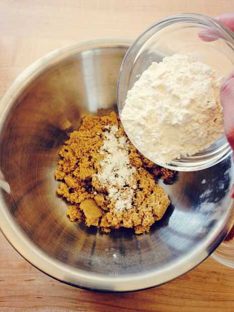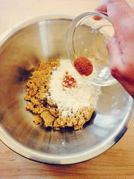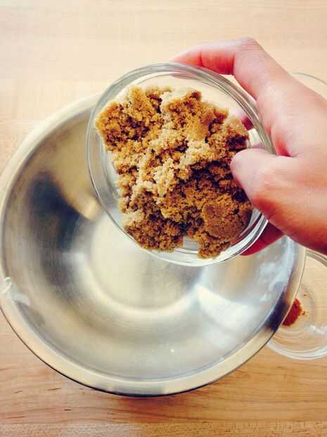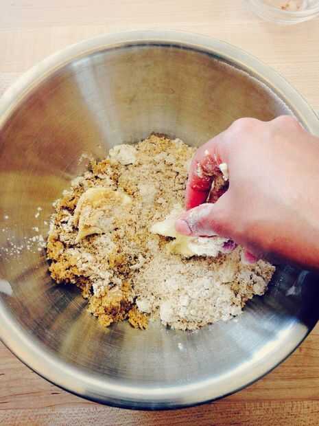 En un nuevo recipiente, mezclar azúcar morena, canela y harina. Añadir (o "cortar") en la mantequilla fría. Hay muchas técnicas diferentes para esto, pero yo prefiero usar mis manos. amasar/lanzamiento/apretón junto hasta que la mezcla se ve como harina gruesa (o como migajas)