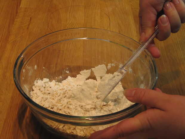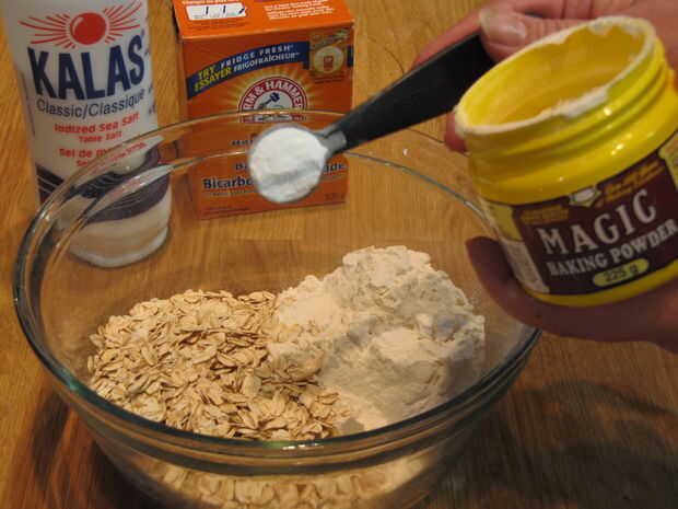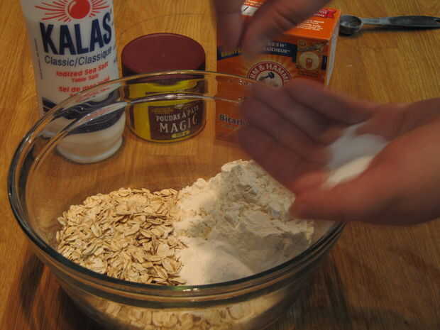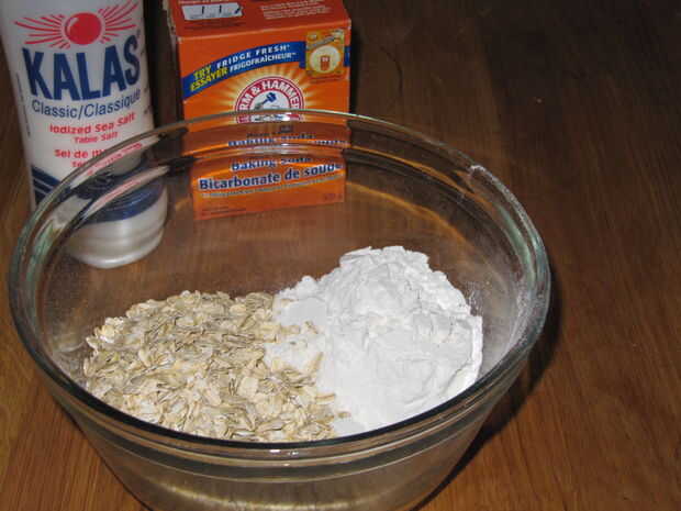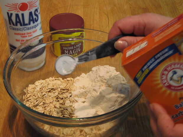 Mezcle la harina, avena, polvo de hornear, bicarbonato y sal junto en un tazón grande.