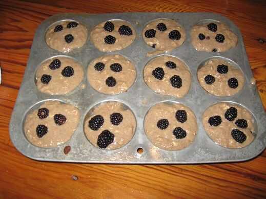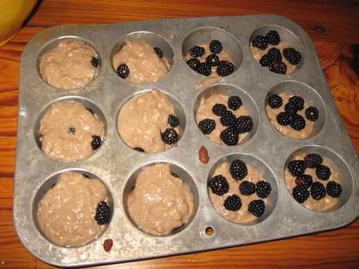 Para asegurar la distribución uniforme de las moras, llené cada lata llena aproximadamente la mitad. Luego que se dejó caer cuatro o cinco moras en la masa. Terminar llenando las latas y otros tres o cuatro en la parte superior, presionándolas un poco a la masa de la gota.