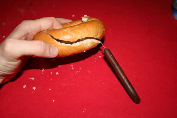 Mirando el bagel cabeza en, en la posición 9:00, introducir el cuchillo en el bagel horizontalmente. Entonces en la 6 posición de reloj o, cortar desde abajo (ver foto). Luego conjunta los dos arriba en diagonal corta están girando el cuchillo alrededor 90degrees a través del corte.
