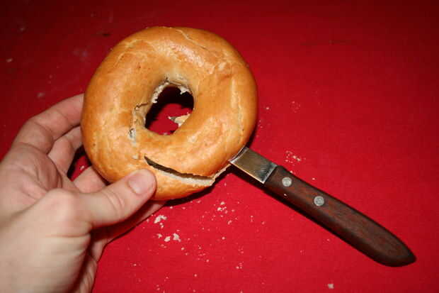 Ahora Repita el proceso en la 3 posición del reloj o en el bagel. Otra vez una incisión horizontal previamente podría ayudar a darle un lugar para 'apuntar' para. No olvide guardar el girar el cuchillo alrededor de bagel que cortado a través. cuando que haya terminado de este corte, empiezas a ser capaz de ver la forma de corte curvo, que utimately voluntad ejecute redondo entero bagel.