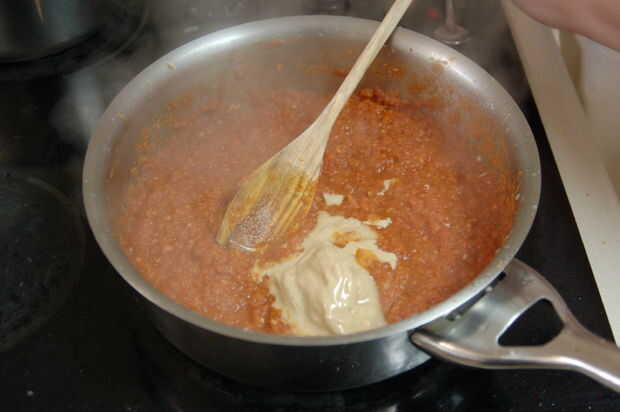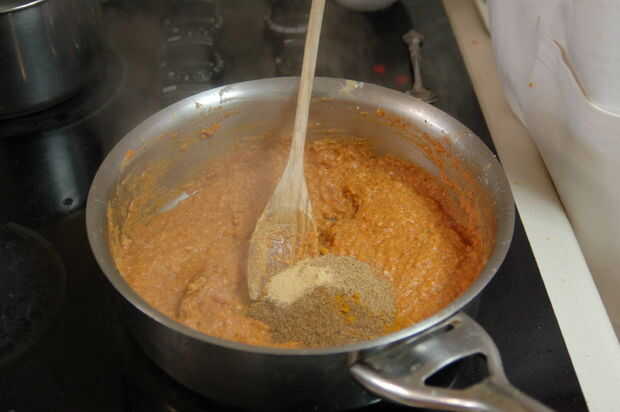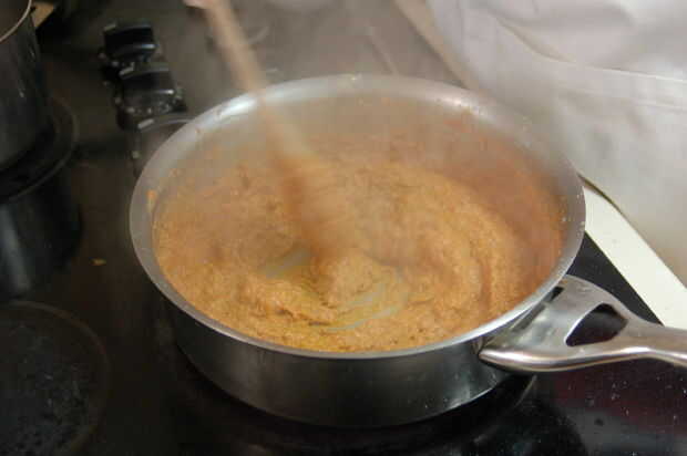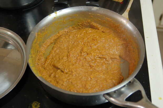 Agregue la mantequilla de anacardo y mezclar. Agregar especias y mezclar. Cocinar a fuego lento durante 20 minutos. Verifique a menudo que la parte inferior no se quema. Si usted encuentra que grabar en la parte inferior, agregue un poco del agua utilizada para hervir las cebollas para delgada hacia fuera. Use una espátula de metal o cuchara para raspar el fondo de la olla.