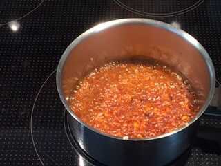 Verter en el resto del aceite y dejar cocer a fuego lento a fuego medio unos 5 minutos.