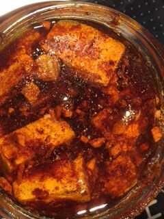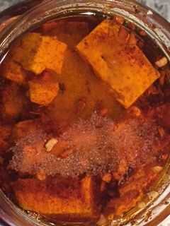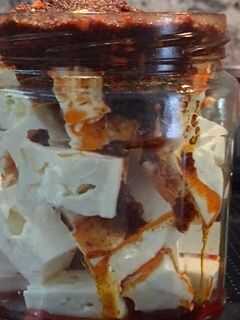 De la cuchara hacia fuera el el sedimento de aceite (fritos especias), en los cubos de queso en el tarro.