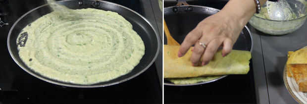 Receta de Pesarattu-Dosa de la haba de Mung - Moong Dal Dosa.Pesarattu es un dosa con todo moong dal (haba de mung o gramo verde). Este tipo de dosa es popular en los Estados indios del sur de Andhra Pradesh y Telangana. Algunos añaden un poco arroz