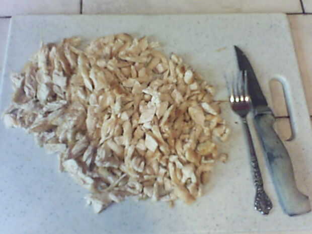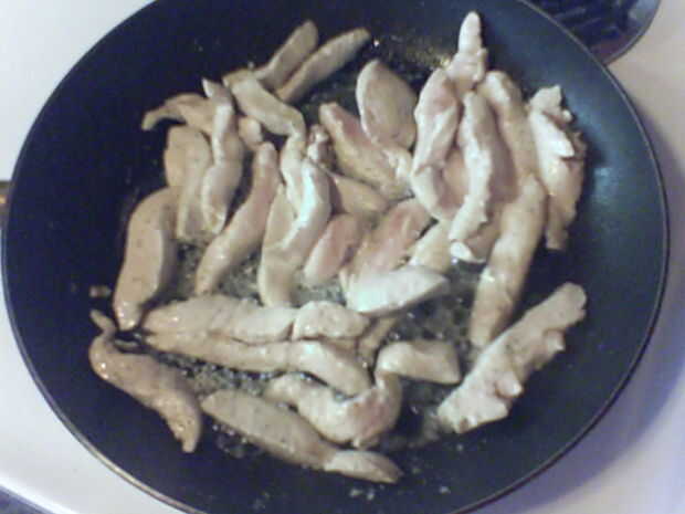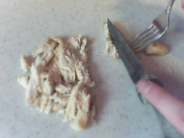 Cocinar el pollo las tiras en medio alto por unos 20 minutos o hasta que ligeramente doradas. Si usando una pechuga entera de pollo se necesita ya cocinar el centro. Entonces después de haber tomado el pollo del fuego durante unos minutos enfriar, usar un tenedor y cuchillo para desmenuzar el pollo en trozos pequeños.