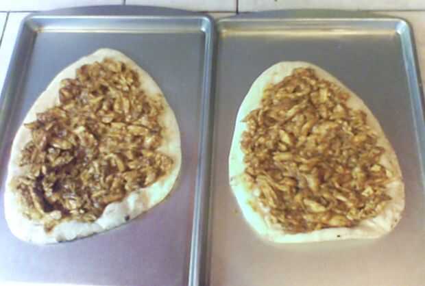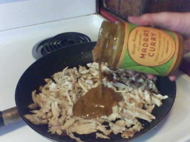 Volver a poner el pollo en la sartén y añadir la salsa de curry de elección. A fuego lento la mezcla durante unos diez minutos realmente cocinar la salsa en el pollo, pero probablemente podría saltar eso y añadir la mezcla de derecha en el Naan porque se calienta en el horno. Luego se extendió la salsa de curry y pollo sobre dos panes planos Naan, o usted podría hacer que funcione para 4 desde que tenía curry sobra mezcla y utiliza porciones de pollo en mis dos.