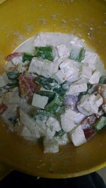 2. mezclar el paneer y marinada en un tazón, mezcle suavemente y mantenga a un lado para macerar durante al menos 1/2 hora. Ajustar el tiempo de más o menos a su horario. Pero cuanto más tiempo Marine, tienden a ser más sabroso. Cortar la cebolla y el pimiento en forma de cubos.