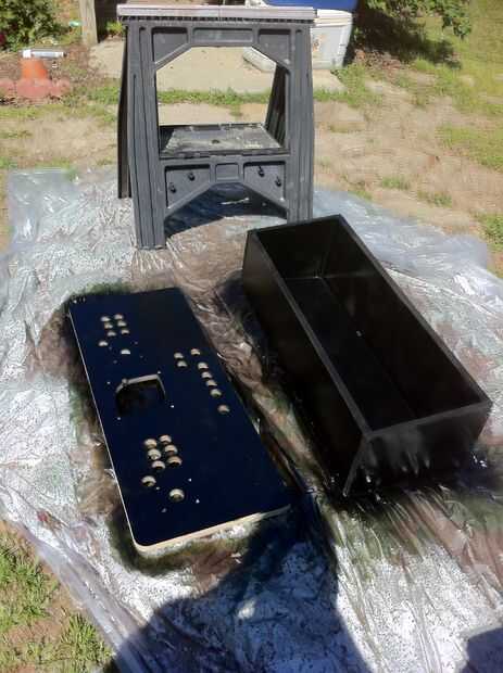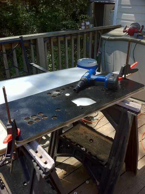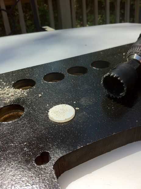 Una vez que el panel superior se haya secado, utilice como guía para cortar la tapa de plexiglás. Que utiliza chatarra MDF como una capa inferior e intercala el plexi en el medio, usando abrazaderas de la barra para asegurar todo. Esta fue mi primera experiencia con el plexi de alto impacto, y soy absolutamente vendido en él. Que algunos bucks más que regulares plexiglás, pero manera stonger y mucho más indulgente. Lexan sería el siguiente paso para arriba, pero en más de 3 veces el precio regular del plexiglás, yo simplemente no podía justificarla. He encontrado usando la sierra en sentido inverso a la manera de cortar los agujeros en el plexi. Literalmente se derrite atravez de ella, dejando un orificio perfecto y borde. Hacer esto para cualquier agujeros más pequeños, así usando la broca de tamaño adecuado a la inversa. El agujero del trackball es un poco más complicado. Haz un agujero grande partido va en medio de ella, y S L O W L Y cortar la forma con una sierra de calar. Si usted tiene una herramienta dremel, hace maravillas para ajustar agujeros ni cortes.