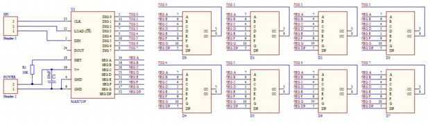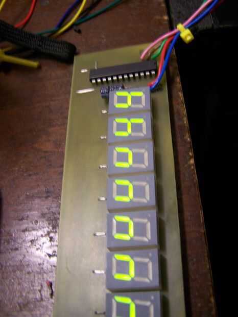 En el centro de ella hay un controlador de pantalla SPI, el MAX7219. Esto es un IC de 24 pines, que utiliza una sola resistencia para establecer la corriente para los dígitos, que es uno de los componentes externo que necesita pantallas de coche (el condensador de 10uF es opcional, si usted sabe que tiene una constante 5V). Tengo un MAX7219 más a la izquierda, podría estar construyendo otro, para ver más información sobre los procesos que están siendo monitoreados. Es una herramienta muy útil para la depuración, también.