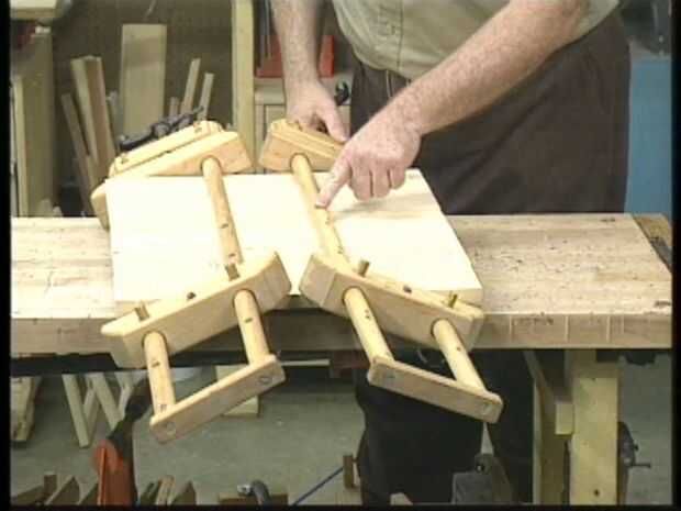 Una abrazadera doble de la pierna es la herramienta de elección para hacer el panel pegar ups ya que iguala la fuerza sobre ambas superficies de la pieza de trabajo y por lo tanto resiste la catación. Éste es muy ligero en peso, en comparación con su hierro fundido y tubo negro rivales, pero es no menos útiles y en gran parte está hecho con retales de madera. Puede utilizar varias de ellas en un proyecto de pegamento del panel y todavía moverlo sobre la tienda con facilidad. Además, puesto que no hizo de metal ferroso, no reaccionan con tannous maderas como roble o cedro y dejar una mancha negra al contacto con el apretón del pegamento, por lo que no son necesarios los separadores o espaciadores. También es una pinza eficaz canal debido al gran tamaño de la ram y cuerpos de yunque. Tiene una capacidad de anchura máxima de 28"(711.2 mm) y 3-½" (88.9 mm) de espesor stock.