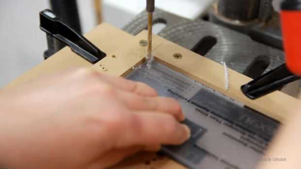 A continuación estoy agujeros en todos los rincones y tengo una plantilla poco configurada, así que tengo las tres piezas de plástico apilados, y entonces puedo perforar a través de todos ellos para hacerlos idénticos, para que a preparar más adelante.