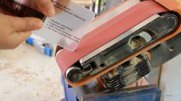 Así que empecé a cortar algunos policarbonato en la Sierra de mesa, y me gusta este material porque es ligero y duradero, pero no rajen o hagan añicos. Necesito tres piezas para esta build para corte a la medida y luego lijar las esquinas, por lo que no son tan afilados.