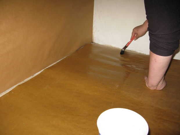Poner un poco en la parte posterior del papel de kraft con el cepillo grande y pegarla a la pared. Poner pegamento en la parte frontal del papel demasiado, esto facilita el proceso de encolado. Este papel en la pared es la base de su panel simulado Tudor sobre el presupuesto.